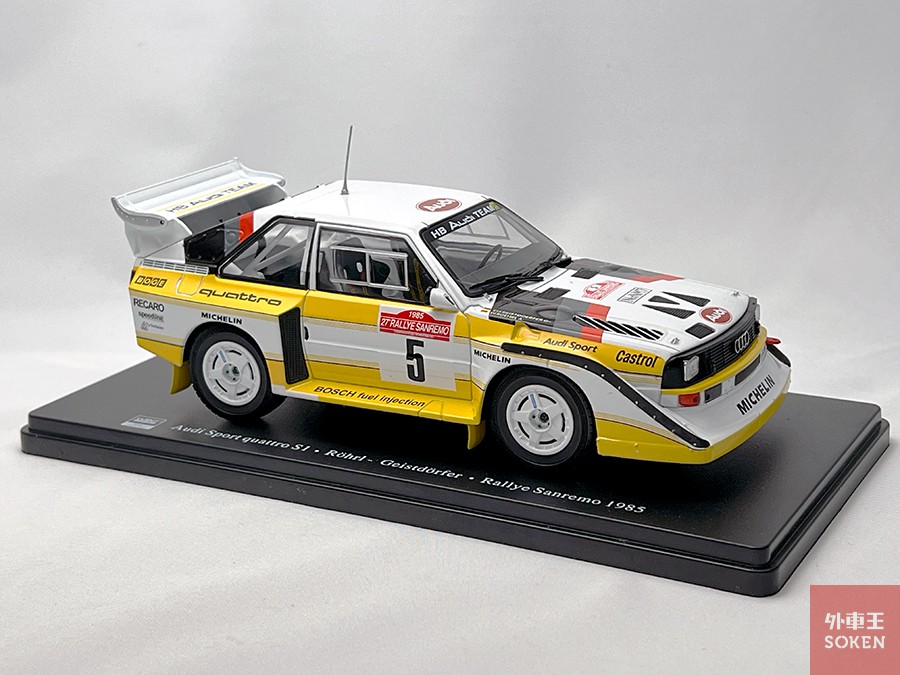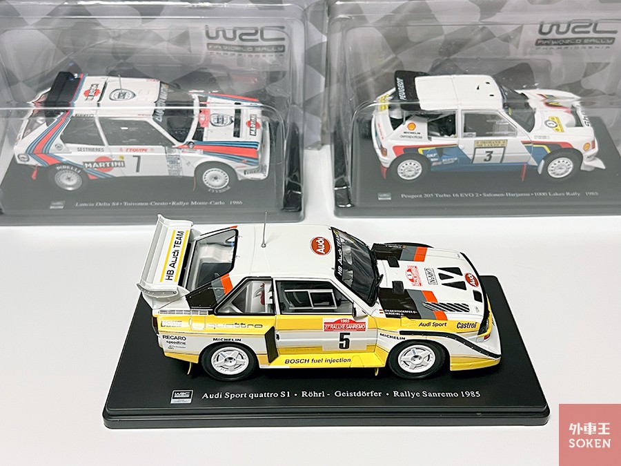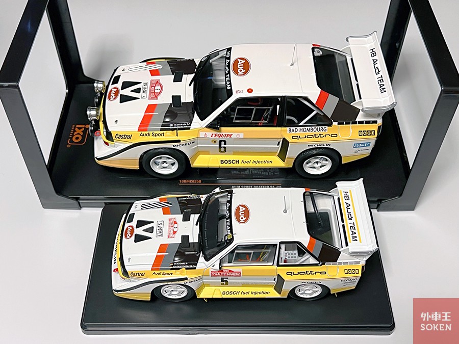 アウディ・スポーツ クワトロ S1のミニカーでサイズ比較をしてみました。上は1/18スケールのイクソ製、下は海外で販売されている1/24スケールのアシェット製品です。