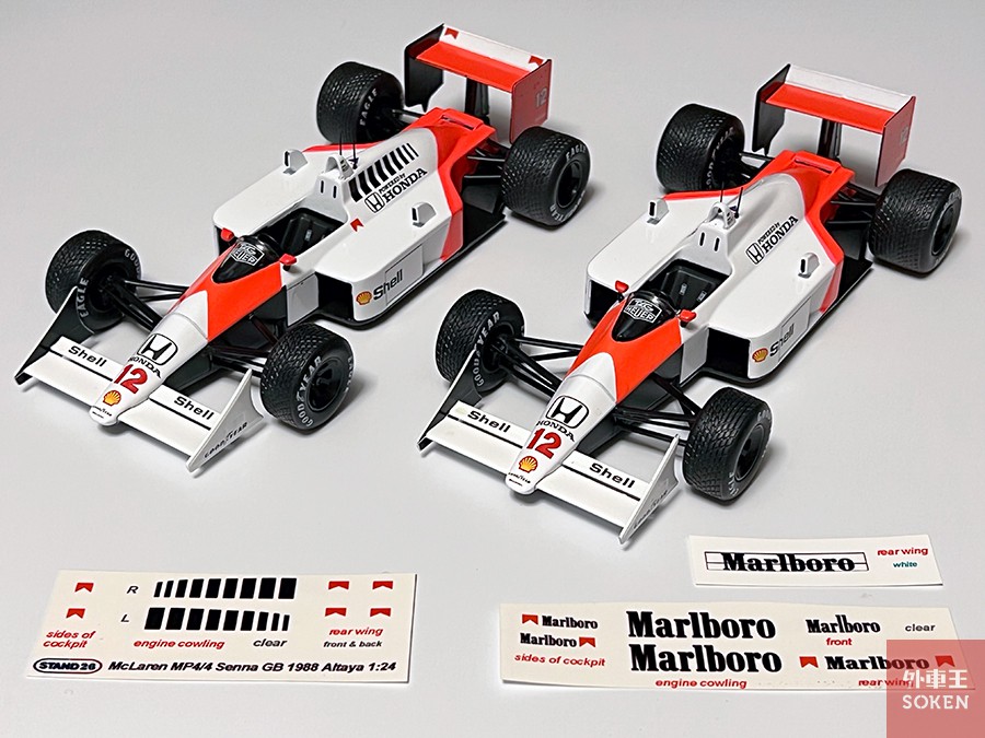 「隔週刊 ビッグスケール F1 コレクション」の創刊号は、アイルトン・セナが初タイトルを獲得した1988年のマクラーレン MP4/4でした。しかし、タバコの広告規制のため当時のMarlboroロゴやマークが再現できず、非常にあっさりとした出来になっています。そのため、サードパーティ製のタバコロゴデカールが流通していて、それを貼ることでよりリアルな印象を与えることができます。