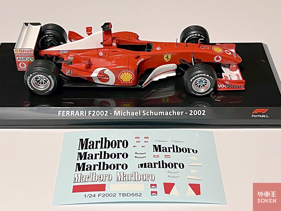 こちらは「隔週刊 ビッグスケール F1 コレクション」第2号のフェラーリ F2002に対応した、イタリアのTBD製デカール。別売のデカールを貼ることでプチ工作が楽しめるという意味においても、この1/24 F1モデルは面白い存在です。