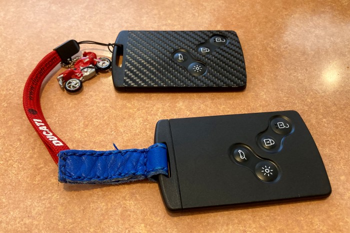 ▲カードタイプのキー。(上)安永さんお手製でカーボン柄に。ボタン部分のくりぬきが器用です!ストラップは以前乗っていたことのある、ドゥカティの限定車。(下)岩岡さんのキーは、奥さまがボディカラーに合わせたレザーを縫いつけてくれたそう!