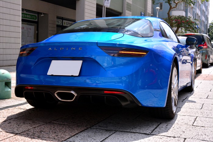▲ボディカラーは、これぞアルピーヌと感じられる“ブルーアルピーヌ(特別塗装色)”。迫力あるリアディフューザーが頼もしい