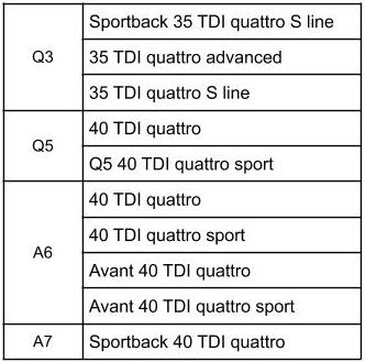 ハイオク仕様の車種は、「A1」、「A3」、「A4」、「A5」、「A6」、「A7」、「A8」、「Q2」、「Q3」、「Q5」、「Q7」、「Q8」、「TT」、「R8」です。