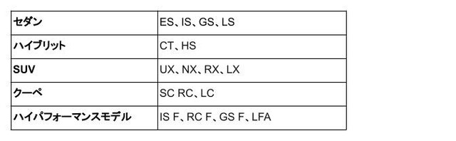 具体的には、高級セダンからコンパクトSUVまで9車種で展開され、価格の高い順から「LS」「LC」「RX」「RC」「IS」「ES」「NX」「CT」「UX」となります。