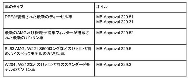 また、ベンツが設けている規格に適合する車種とオイルについては以下を参考にしてください。