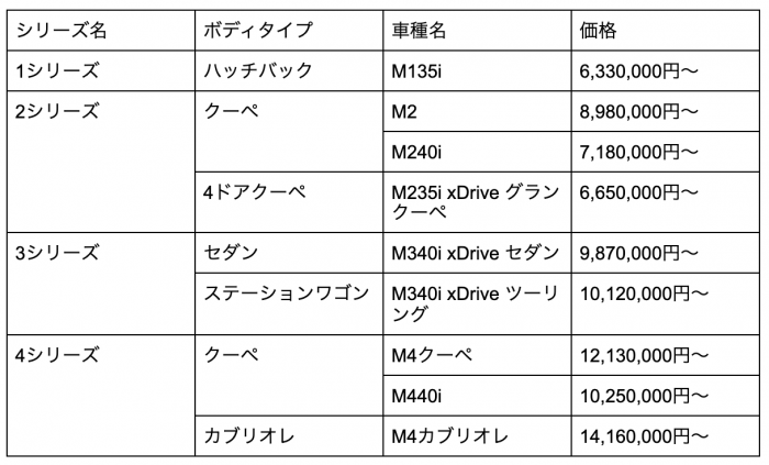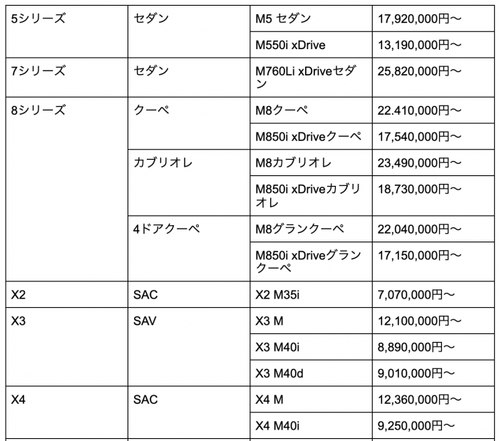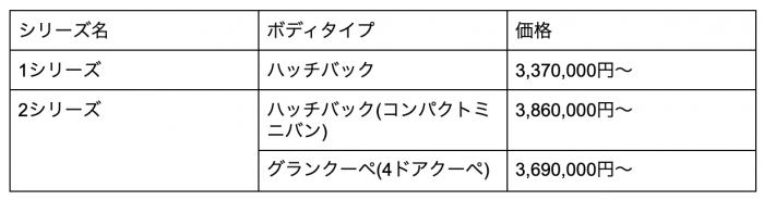 BMWのシリーズ一覧、ラインナップと価格は次の通りです。