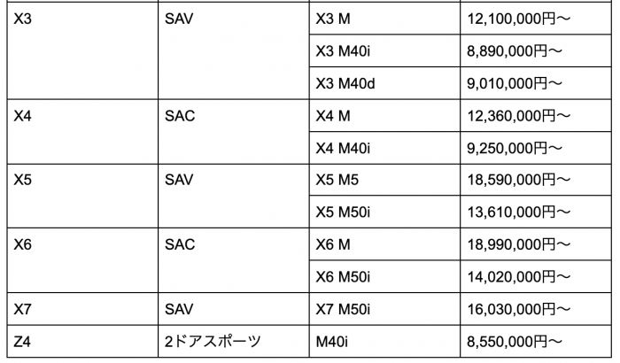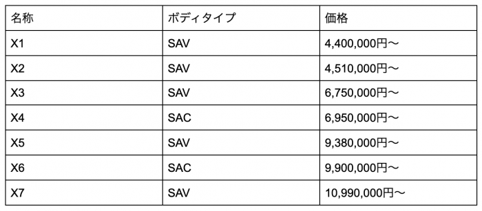 また、BMWではSUVのことを「SAV(スポーツ・アクティビティ・ビークル)」または「SAC(スポーツ・アクティビティ・クーペ)」と表記しています。SUVであっても、BMWらしい運動性能や走行フィールを実現していることから、SAVやSACという表記が使われているのです。BMWが展開するSUVの「Xシリーズ」の一覧と価格は、次の通りとなっています。
