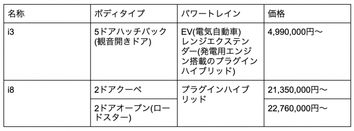 「iシリーズ」は、BMWのサブブランドとして設立された「BMW i」から販売される電気自動車、またはプラグインハイブリッドモデルです。高い環境性能を実現するパワートレインのみならず、内装にリサイクルプラスチックを使用し、地球環境を考えた車づくりがされています。BMW iがリリースし、日本に導入されているモデルおよび価格次の通りです。