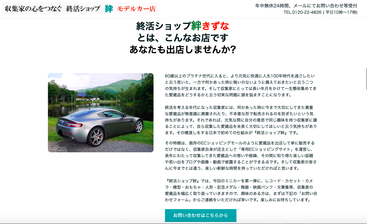 これは終活年代になった収集家を対象にした愛蔵品の販売サイト。第1号店として「終活ショップ 絆 モデルカー店」がオープンしていて、アストンマーティンの1/43レジン完成品ミニカーを中心に、数十点の商品が販売されています。