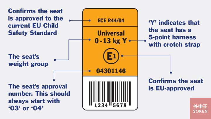 ▲こちらはECE R44/04に適合したチャイルドシートにつけられるラベル。E1の「1」はドイツで認証を受けた製品という意味がある