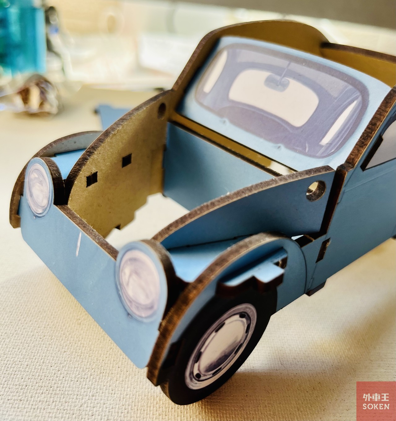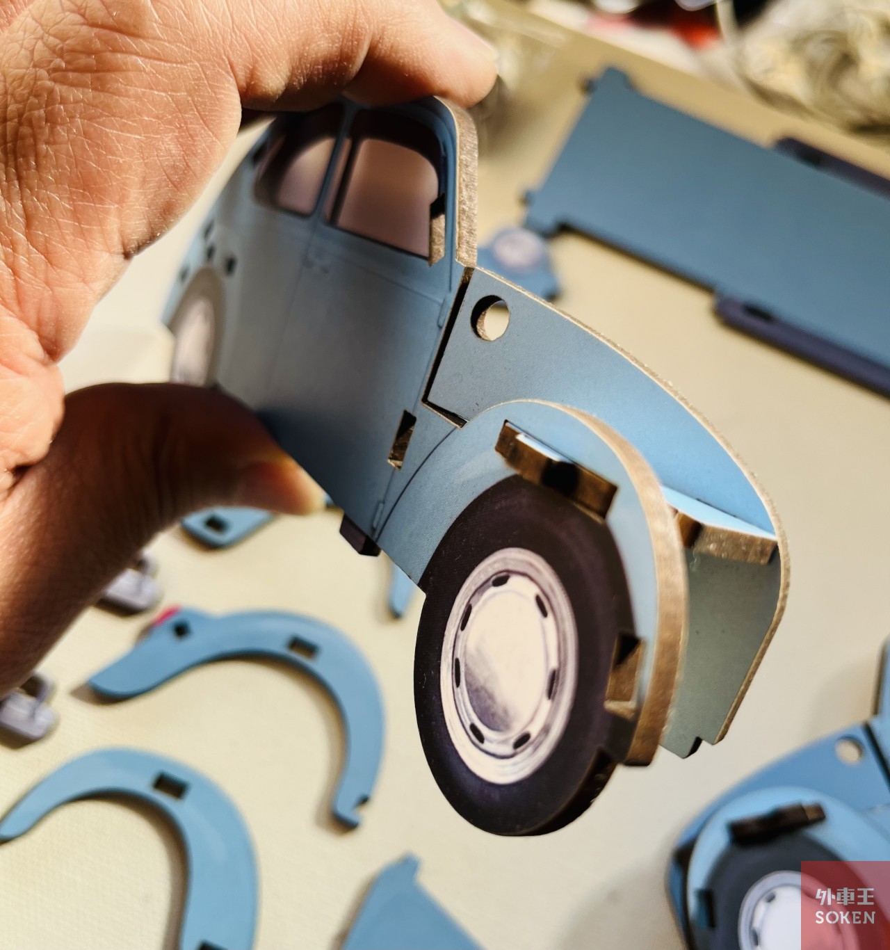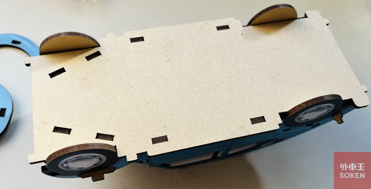 ここまできたら、シャーシ、というか底板をハメ込んで全体を補強。バンパーとフェンダーを取り付けて完成!というわけなのですが、実はこのフェンダー、他のパーツがほぼキマっている状態で、上からパキパキはめ込んでゆくので、少々無理矢理というか、強引な組み込みが必要でした。