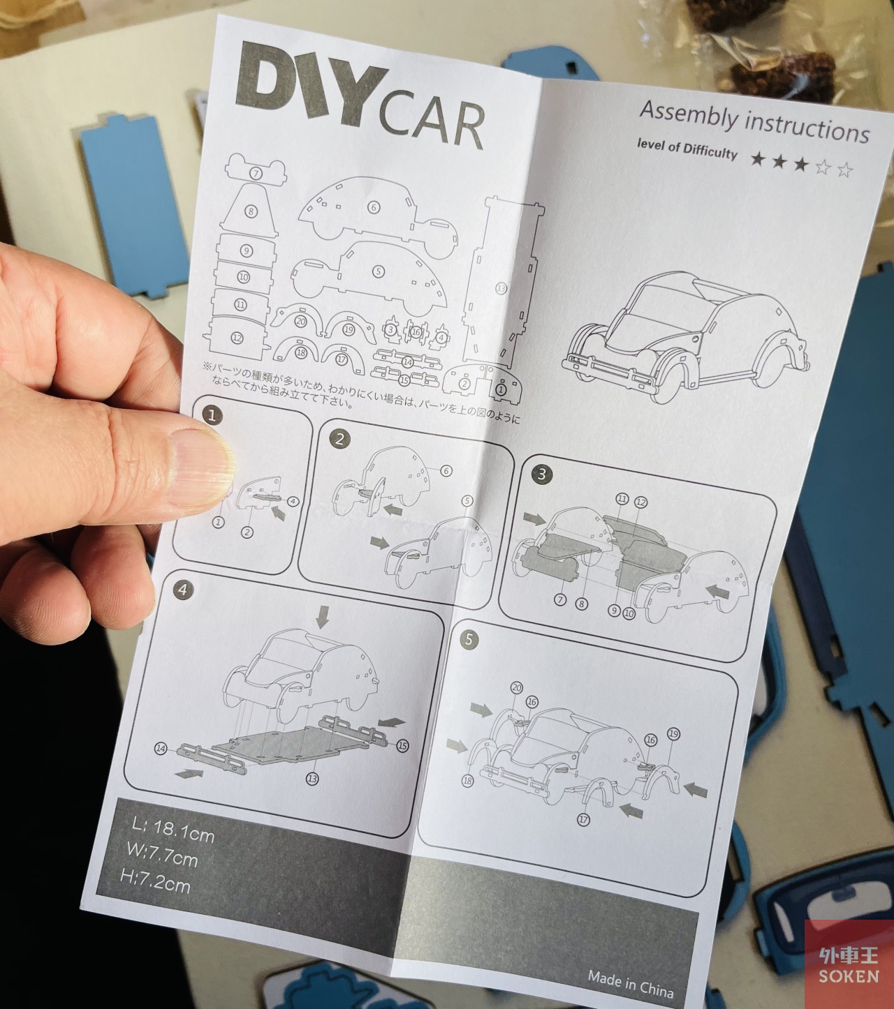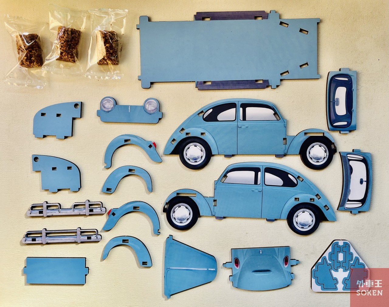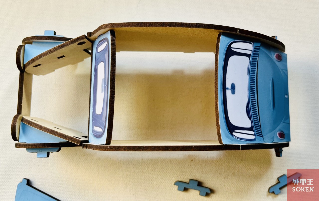 さて、パッケージをバリバリあけて中身を取り出すと、合板に印刷されたクルマのパーツとインストラクションシートが一枚。それにチョコ3個。パーツを見てみると横からのシルエットはなんとなく旧ビートルっぽい感じがしますね。丸い目玉と両生類の顔みたいなリアトランク(というか、これがボンネット?)が可愛い。フェンダーは別パーツになっていたりで、計21個のパーツに分かれています。