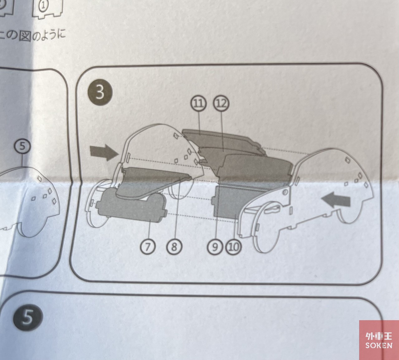 インストラクションシートの「3番目」に難関が立ちはだかりました。左右のボディと、その間のボンネット、フロントガラス。中の補強財。リアガラス、リアフードをまとめてくっつけろ!ときましたよコレ。それでなくてもハメ合わせ微妙なのに、まとめて一発でコレやれって、どうすんだオレ。