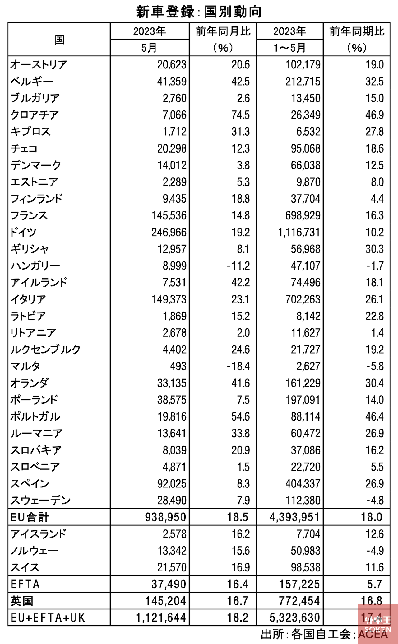 欧州自動車工業会(ACEA)は21日、欧州連合(EU)の2023年5月の乗用車新車販売(新車登録)が93万8,950台となり、前年同月に比べ18.5%増加したと発表した。販売増加は10カ月連続。主要4カ国ではイタリア(23.1%増)、ドイツ(19.2%増)、フランス(14.8%増)が2ケタの増加率となり、スペイン(8.3%増)も前年同月を上回った。1~5月の累計は、前年同期比18.0%増の439万3,951台となった。ただ、コロナ禍前の2019年1~5月期と比べると、依然として23%少ない水準にとどまる。