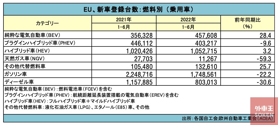 欧州自動車工業会(ACEA)によると、欧州連合(EU)における2022年上半期(1~6月)のの乗用車新車登録に占める純粋な電気自動車(BEV)は前年同期比28.4%増の45万7,608台となり、市場シェアは9.9%となった。