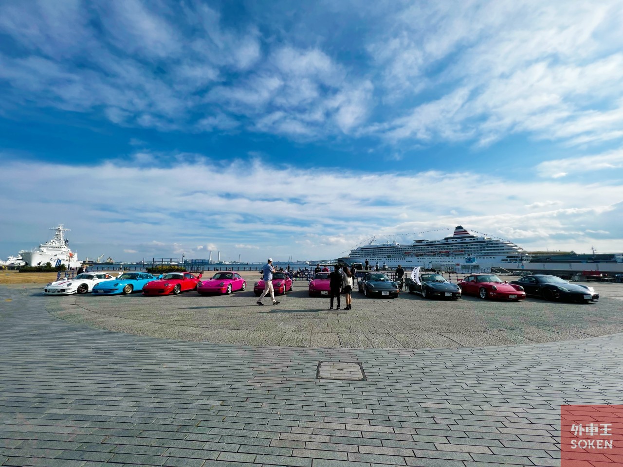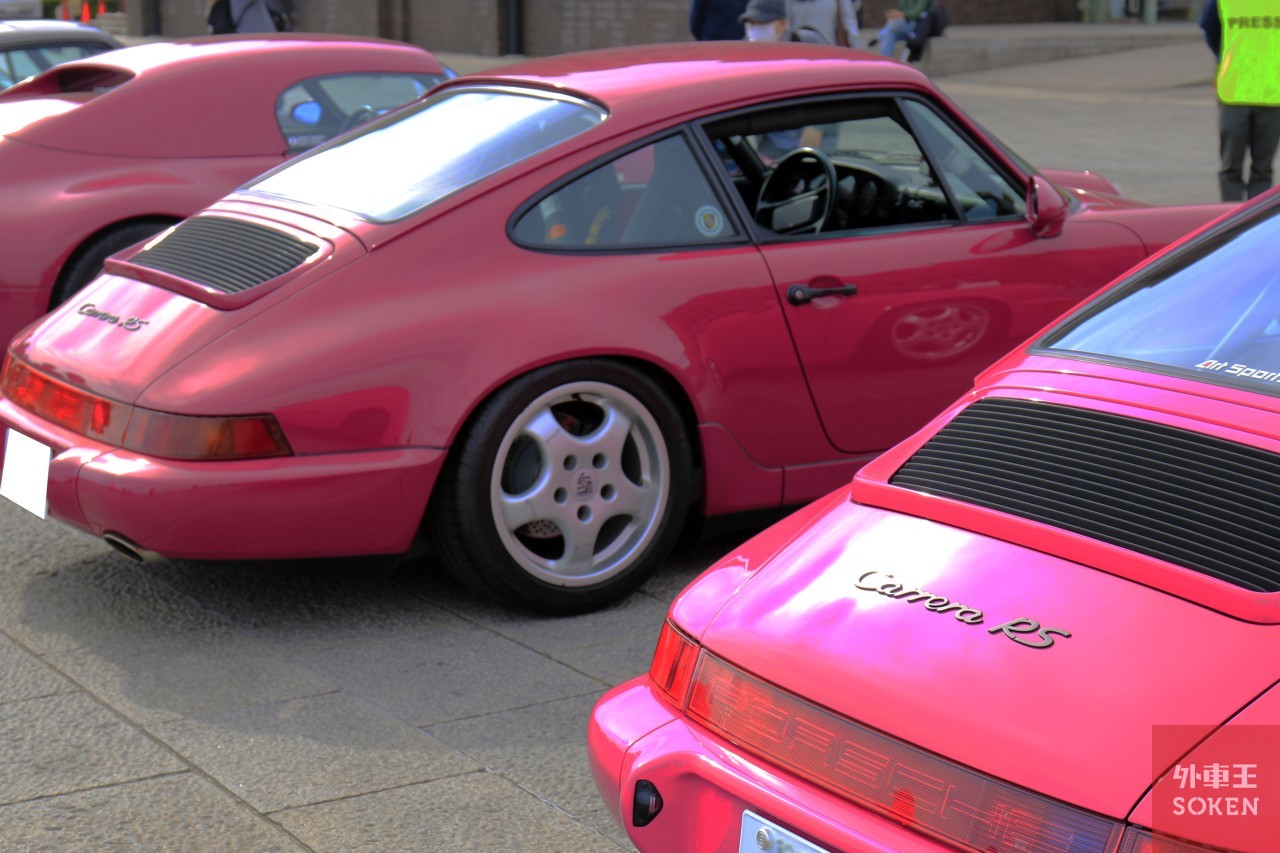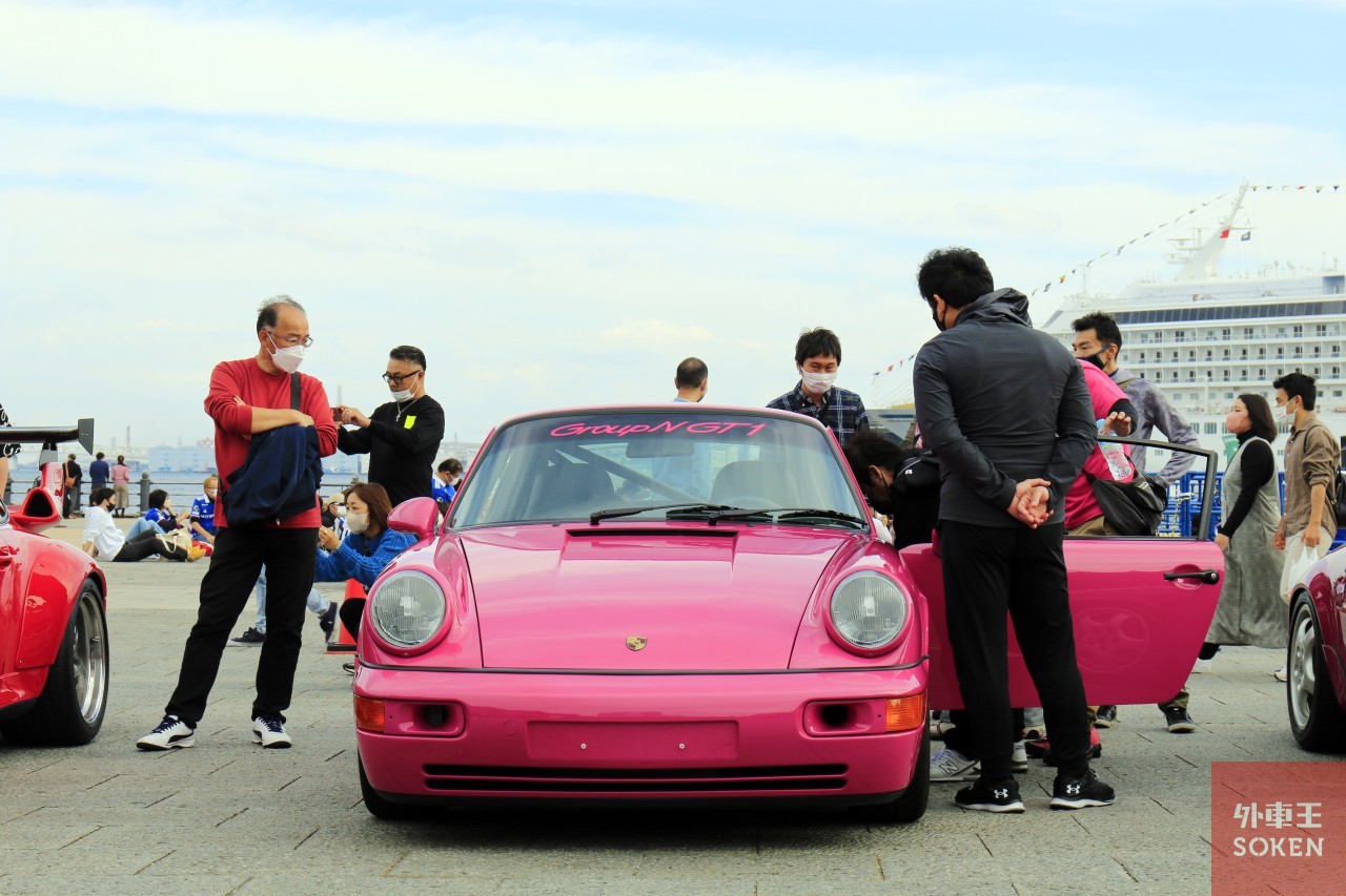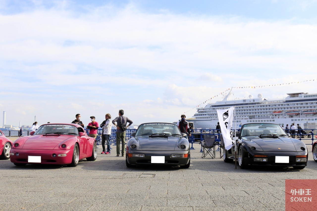 現在、横浜赤レンガ倉庫は改装工事中。建物の一部には足場が組まれ、室内には入れない状態です(そのため、いつもよりトイレが遠い!)。知る限りではエキサイティングポルシェ史上初となる、湾内がメインステージに。豪華客船 「飛鳥II」を背景に眺めつつ、シュトロゼックのコンプリートモデルや、ピンク系のボディーカラーをまとったスペシャルモデル(シュトロゼック メガ スピードスター RS、964RSワンオーナーカー、964RS-Racing)、993GT2が一列に並ぶという、エキサイティングポルシェらしい壮観な光景となりました。これは「映え」ますね。*シュトロゼック メガ スピードスター RSのオーナーは、 漫画「彼女のカレラ」の原作者である麻宮騎亜先生の愛車です!