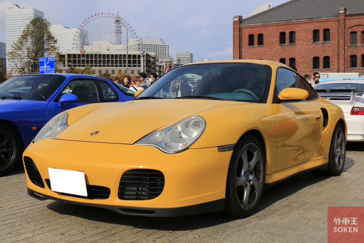 いまや、ポルシェクラシックのカテゴリーに属するタイプ996。好みの分かれる顔つきも「996でなきゃ!」という、熱烈ラバーなファンがいることも事実です。会場内を歩いていて、ナローから993までの「空冷エンジン911」と、996以降の「水冷エンジン911」では、オーナーの雰囲気が変わってくるのが不思議です。取材班が注目したのは、スピードイエローのボディーカラーにグリーンの内装というレアな組み合わせの996ターボ。お洒落な仕様ですね。