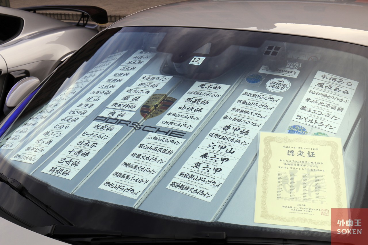 そして現行モデルにあたるタイプ992。エントリー台数は少なめですが、限定992台という「911タルガ4Sヘリテージデザインエディション」も展示されていました。チェリーメタリックというボディーカラーとベージュ(内装は2トーン!)の組み合わせがお洒落です。横浜赤レンガ倉庫の風景とマッチしていますね。クレヨンのボディーカラーをまとった992のフロントウィンドウには・・・?各地の「峠ステッカー」とコンプリートを証明する認定証が誇らしげに掲げられていました。オーナーさん、すごすぎる・・・。
