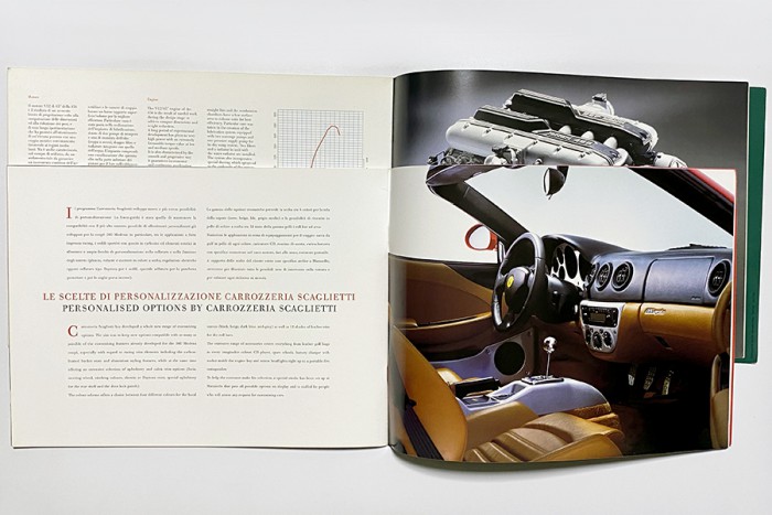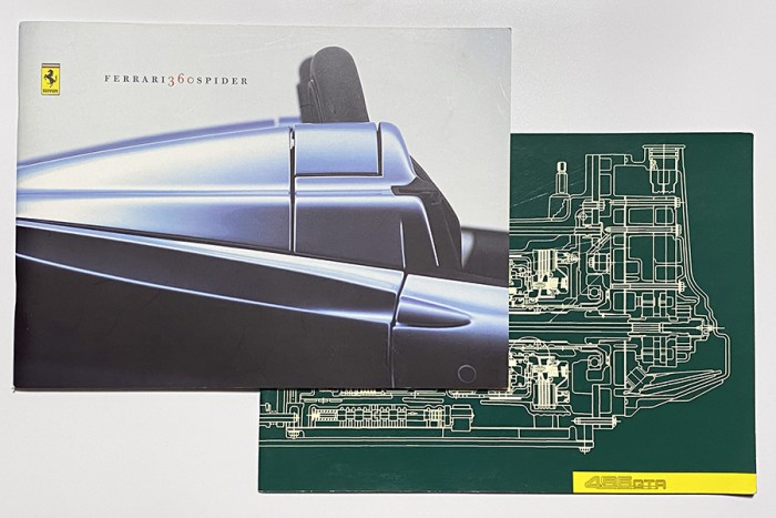 横長タイプの冊子はすでにF355やF50などのプレスキットとして登場していたもので、写真の456 GTAの冊子のように、象徴的なディテールの図面をあしらった表紙が特徴でした。360 スパイダーのカタログはプレスキットと同じサイズで、575M マラネロは正方形タイプの判型でした。