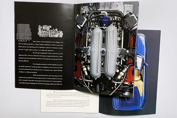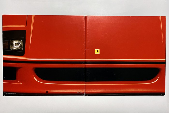 F40の本カタログは、フェラーリのカタログのなかでも別格の存在感を誇ります。幅33cm、高さ32.5cmというサイズ自体も大きいのですが、1枚モノの紙を折りたたんだ構成になっているのが特徴。そのため、折りたたまれたページを左右に展開すると、実に3.3メートルにもおよぶ大パノラマが展開されます。同様の構成となる348tb/tsとともに、ビジュアル的に見せるカタログの集大成的な内容でした。