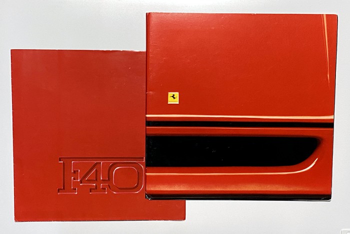 フェラーリ F40は、右の本カタログと左の四つ折りリーフレットカタログがつくられました。リーフレットカタログには初期のプロトタイプの写真が使用され、本カタログでは量産型の写真が使用されています。