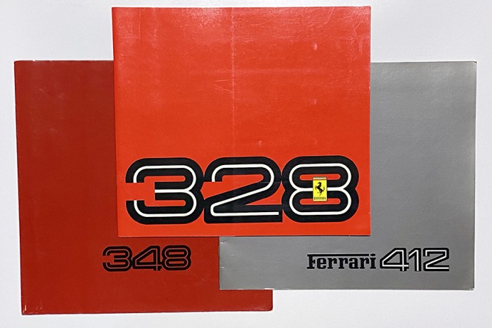 写真は、1980年代半ばから後半にかけてデビューした、328 GTB/GTS、412、348のカタログ。328 GTB/GTSと412は伊・仏・英・独の4ヶ国語表記となる標準的なカタログで、348は簡易的なリーフレットカタログです。