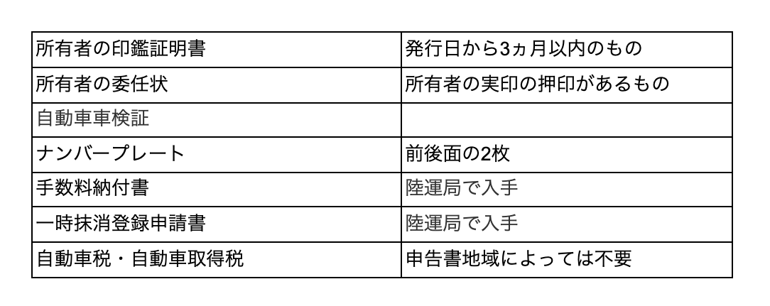 業者に依頼した場合に発生する代行手数料を節約できることです。全ての手続きを自分で行うので、行政書士や専門業車に依頼した場合に必要となる5,000円〜30,000円の代行手数料が不要となります。また、一時抹消、永久抹消の申請が行われると自賠責保険ならびに自動車税が月割りで返還されます。さらに、永久抹消は自動車重量税の還付も行われるので忘れずに申請しましょう。また、一時抹消を行うと税負担なく車を保管できるのもメリットと言えます。なお、自分で手続きを行う場合に必要な書類は以下の通りです。
