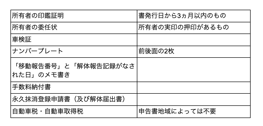 廃車登録に伴う手続きが煩雑で難解、一時抹消後は自走での移動に制限がある、永久抹消は解体後ではないと申請できないの3つです。陸運局で抹消登録を行う場合には、一時抹消、永久抹消ともに上述の必要書類を準備し陸運局に申請します。しかし、この書類の記入方法や陸運局での手続きは細かな説明や案内が無く、初めて手続きに行った人にはハードルが高いでしょう。