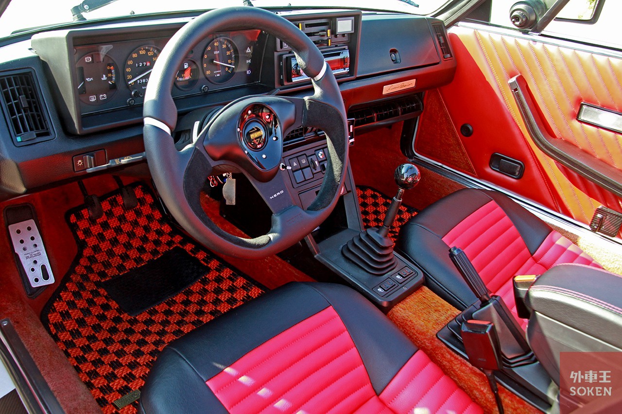 「まず、劣化していた内装の張り替えですね。県内の腕の良い職人に依頼しました。ステアリングはMOMOに。ヘッドライトはLED化してあります。足回りもリフレッシュしていて、車高調はD2 JAPANのタイプストリートを。ホイールはバラマンディデザインのベステルというモデルです。15インチのものを履いています」