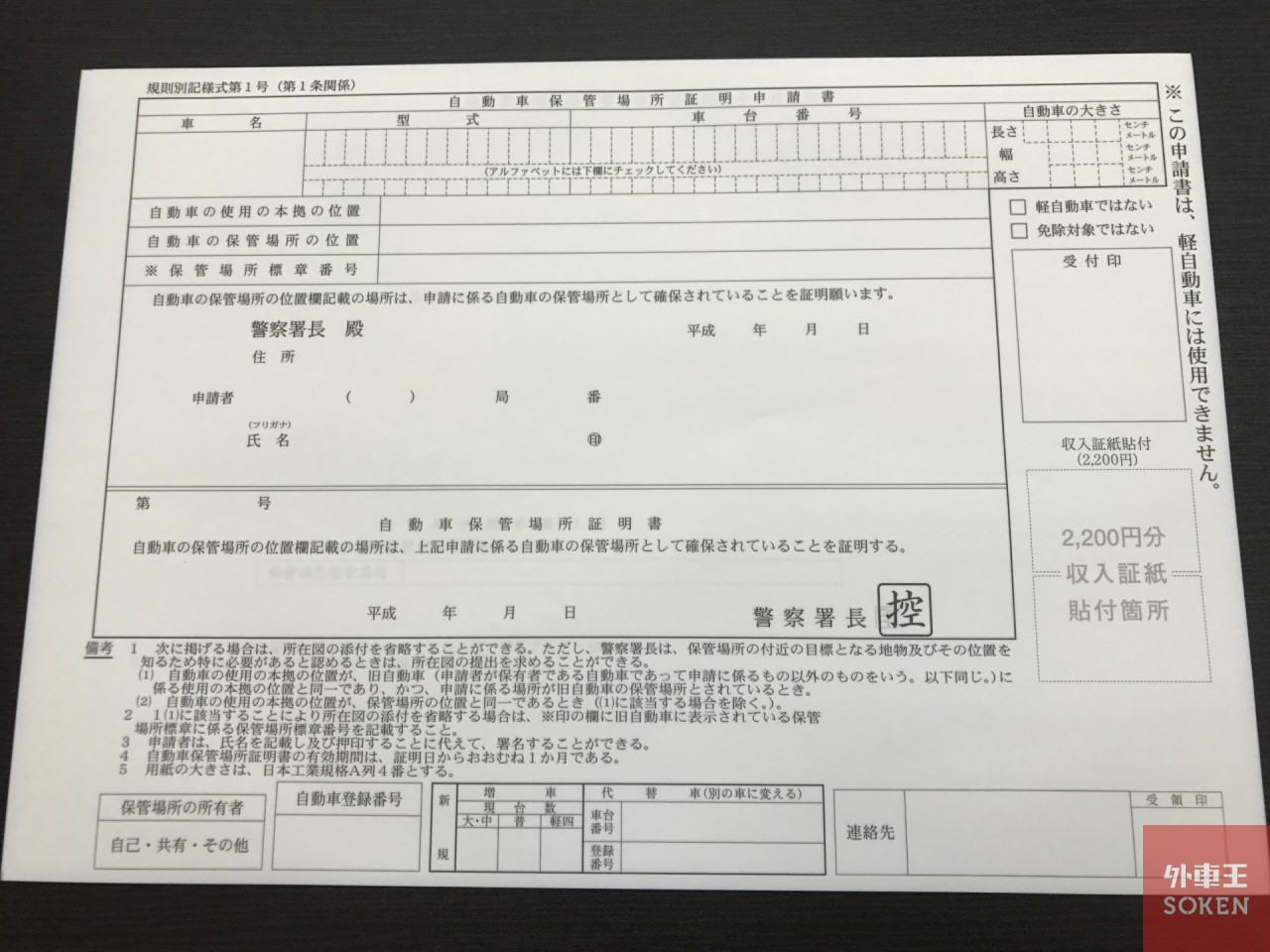 自動車保管場所証明申請書 | クルマの車名、型式、車台番号、大きさなどの車輌情報と、使用者の住所、保管場所の住所などを記載する書類。 | |