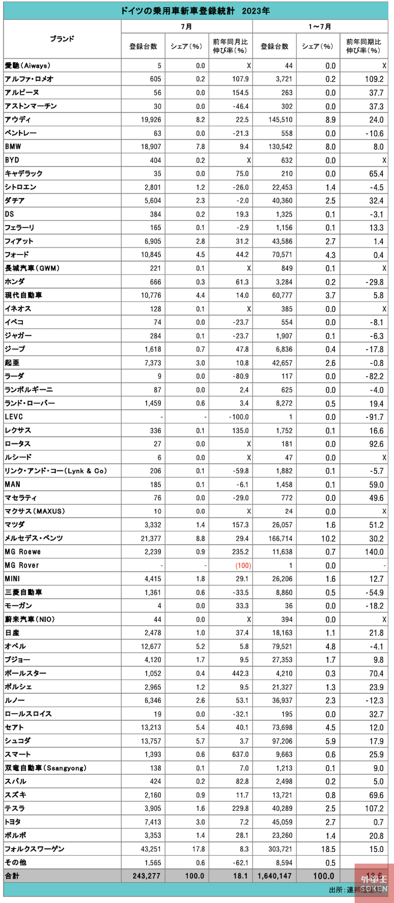 7月のブランド別の登録台数では、ドイツ勢は、スマート(637.0%増)が急伸したほか、ドイツフォード(44.2%増)、メルセデスベンツ(29.4%増)、MINI(29.1%増)、アウディ(22.5%増)が2ケタ台の増加率だった。