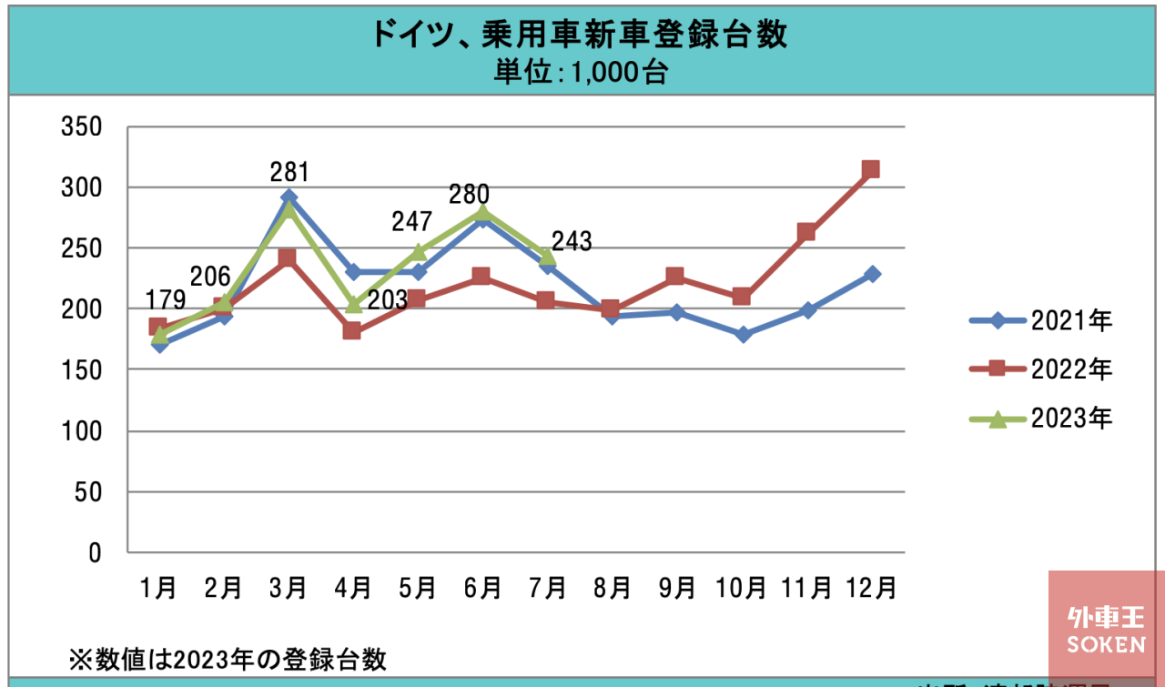 ドイツ連邦陸運局(KBA)は4日、同国の2023年7月の乗用車新車登録が24万3,277台となり、前年同月に比べ18.1%増加したと発表した。このうち、法人は前年同月比24.9%増の16万7,485台で、全体の68.8%を占めた。個人は、前年同月比5.5%増の7万5,611台(市場シェア:31.1%)だった。1~7月の累計も、前年同期比13.6%増の164万147台と2ケタ台の増加率だった。なお、2019年1~7月の水準を依然として25%下回っている。