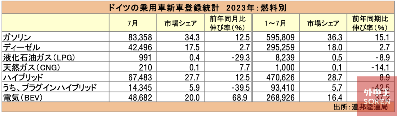 7月の燃料別の登録台数は、純粋な電気自動車(BEV)が前年同月比68.9%増の4万8,682台で、市場シェアを20.0%に拡大した。