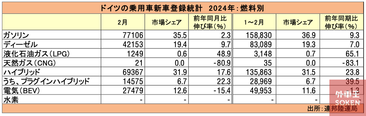2024年2月の燃料別の登録台数は、純粋な電気自動車(BEV)が前年同月比15.4%減の2万7,479台で、市場シェアは12.6%だった。ハイブリッド車は、前年同月比17.6%増の6万9,367台で、市場シェアは31.9%、うち、プラグインハイブリッド車(PHEV)は、前年同月比22.3%増の1万4,575台で、市場シェアは6.7%だった。