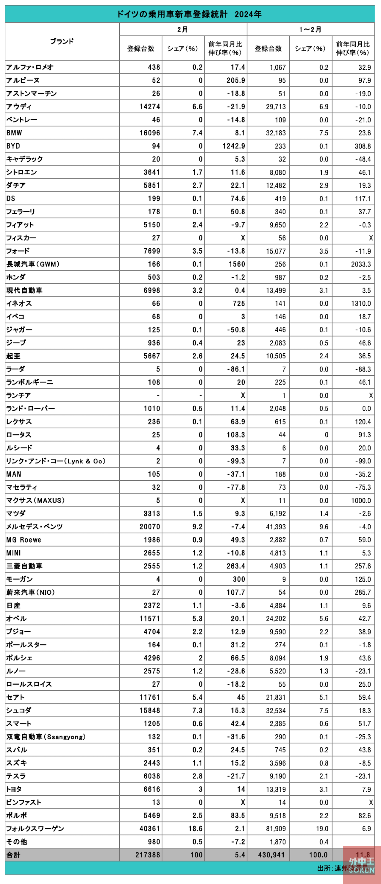 ブランド別では、ドイツ勢は、ポルシェ(66.5%増)、スマート(42.4%増)、オペル(20.1%増)が2ケタの増加率だった。国外ブランドでは、セアト(45.0%増)、ボルボ(83.5%増)、起亜(24.5%増)、ダチア(22.1%増)、シュコダ(15.3%増)などが好調だった。