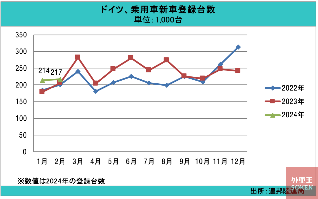 ドイツ連邦陸運局(KBA)は5日、同国の2024年2月の乗用車新車登録が21万7,388台となり、前年同月に比べ5.4%増加したと発表した。1~2月の累計は、前年同期比11.8%増の43万941台となった。なお、1~2月までの新車登録をコロナ前の2019年同期と比較すると、依然として約19%(約10万台)下回る水準となっている。
