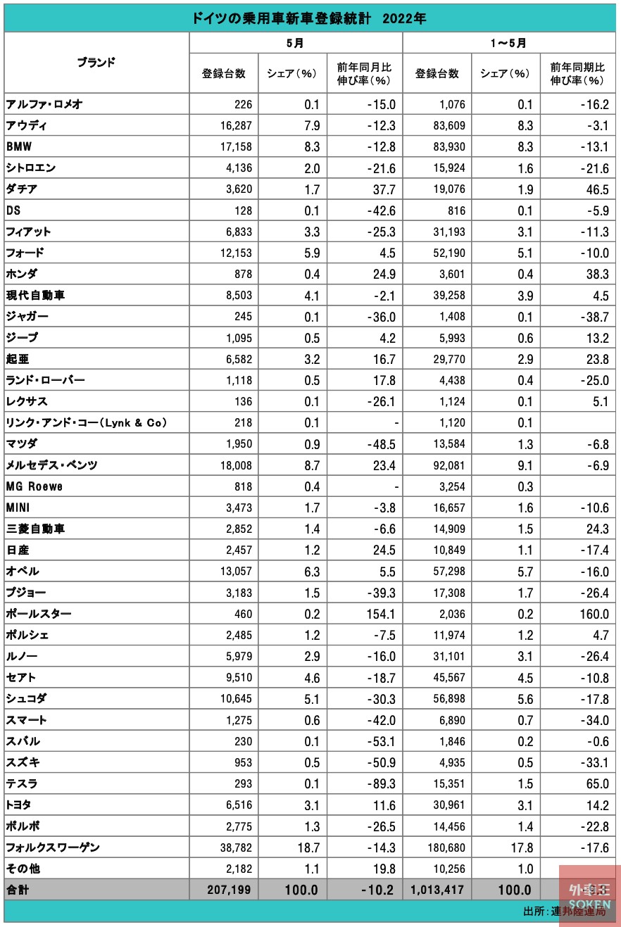 ブランド別の5月の登録台数では、メルセデス・ベンツ(23.4%増)、オペル(5.5%増)、ドイツ・フォード(4.5%増)が前年同月を上回った。これに対し、スマート(42.0%減)、フォルクスワーゲン(14.3%減)、BMW(12.8%減)、アウディ(12.3%減)は2ケタの減少となり、ポルシェ(7.5%減)、MINI(3.8%減)も前年同月を下回った。