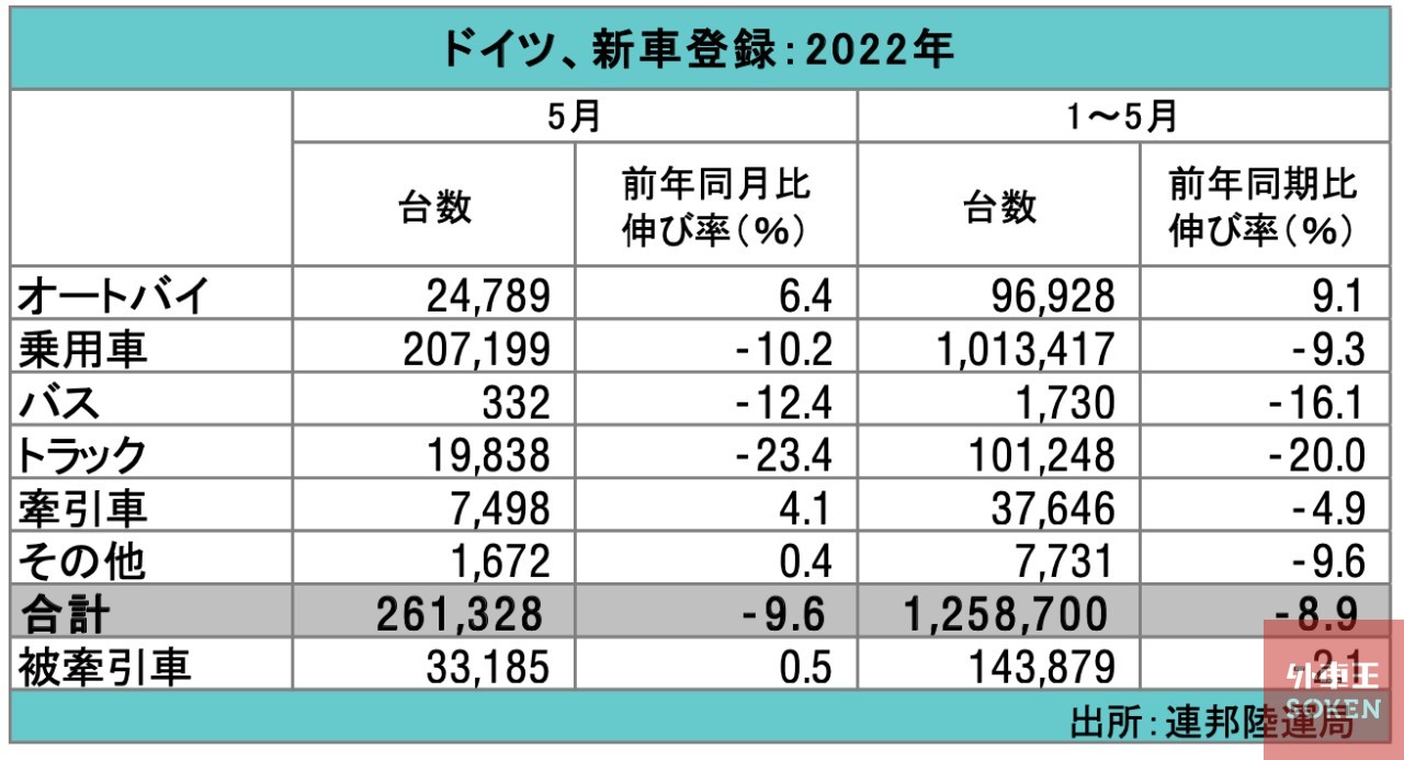 ドイツ連邦陸運局(KBA)は3日、2022年5月の国内乗用車新車登録が20万7,199台となり、前年同月に比べ10.2%減少したと発表した。半導体など電子部品の供給不足や原料価格の上昇、ウクライナ戦争による先行き不透明感などが新車販売の低迷の背景にある。1~5月の累計は、前年同期比9.3%減の101万3,417台だった。これは、新型コロナウイルスの世界的な感染拡大(パンデミック)前の2019年1~5月の新車登録を33%下回る水準となる。