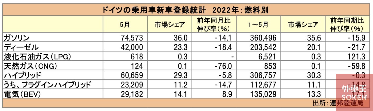 燃料別の5月の登録台数は、純粋な電気自動車(BEV)は前年同月比8.9%増の2万9,182台となり、市場シェアを14.1%に拡大した。その他の燃料は、前年同月を下回っており、ガソリン車は前年同月比14.1%減の7万4,573台(市場シェア:36.0%)だった。登録台数が2番目に多かったのはハイブリッド車で、前年同月比5.8%減の6万659台、市場シェアは29.3%だった。うち、プラグインハイブリッド車は2万3,209台(前年同月比:14.7%減、市場シェア:11.2%)を占めている。ディーゼル車は、前年同期比18.4%減の4万2,000台にとどまり、市場シェアは20.3%に縮小している。
