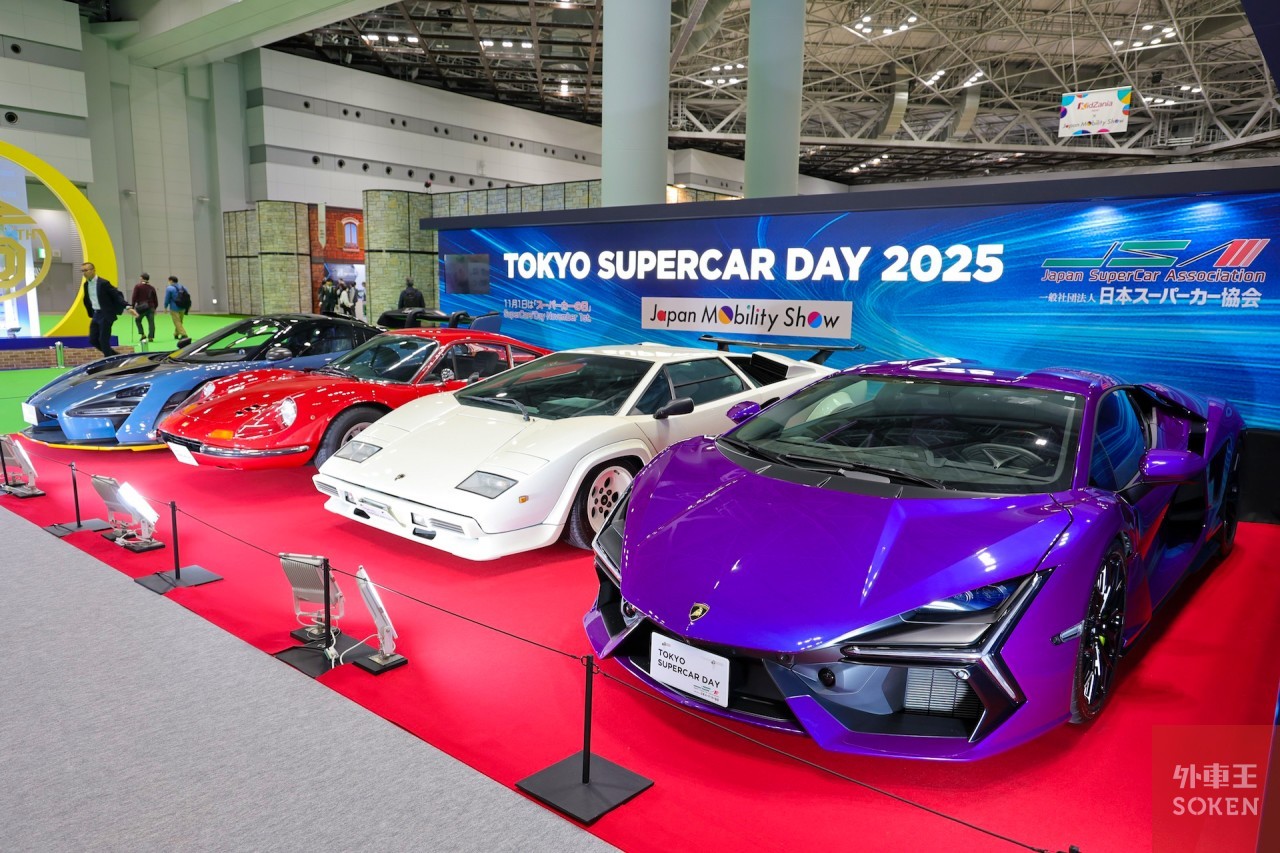 東京ビッグサイト 南ホール3・4ホールには「TOKYO SUPERCAR DAY 2025 in JMS」のブースが、約20社の協力企業による23台のハイパーカーやスーパーカー、国産スポーツカーやバイクをが展示され、華やかな雰囲気に。