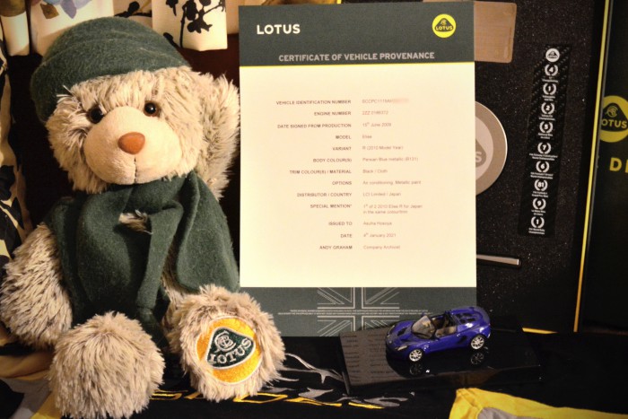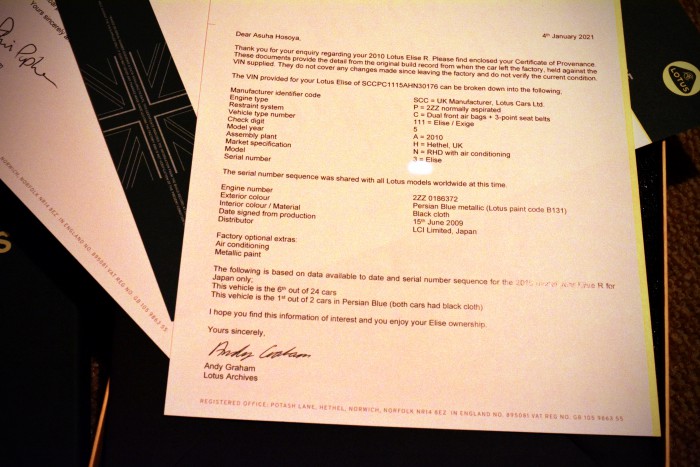 昨年(2020年)9月、ロータス日本正規代理店から、『Certificate of Provenance(出所証明書)の受付を開始する』とのアナウンスがあったのです!