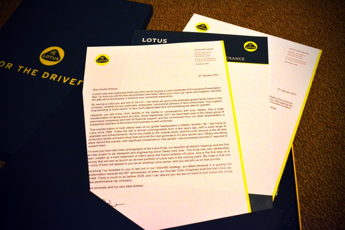 これはロータスカーズ(英)が、ロータスオーナーに向けて、愛車の製造記録を記念品として提供するという趣向のサービス。