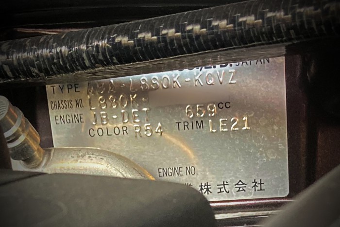 ▲コペンのコーションプレート。日本車は排ガス規制に関する記号も記されています。少し見づらいですが、TYPE欄のABAが『平成17年排出基準適合』の意