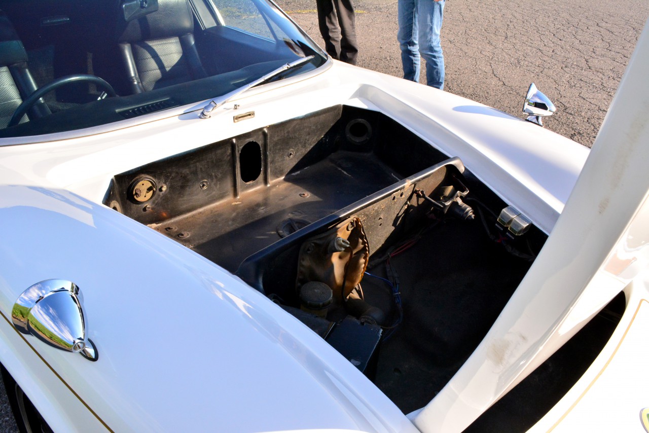▲もともとのボディカラーはブルーだったようで、その名残がコーションプレートのカラーコード刻印に残っています。トランク内にわずかに見える青い部分が、当初の塗装だろうとのこと。ウォッシャータンクはバッグ型!