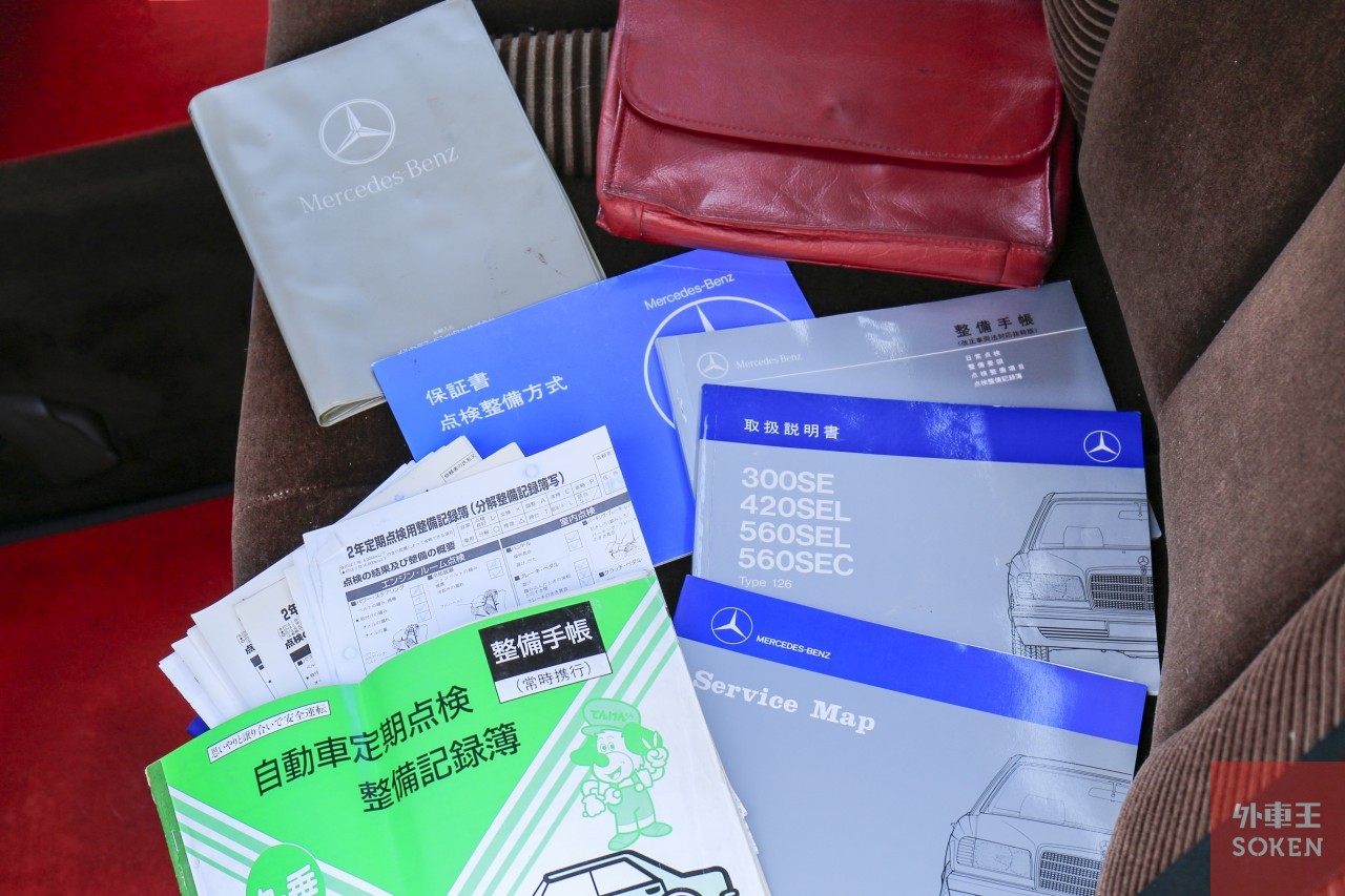 引き継ぎ可能な2ケタナンバー、ちょっとレアな内外装の組み合わせ。外装もフレーム修正なくボディの素性が良い状態であったこと、整備記録簿がきちんと残っていて走行距離の裏付けが取れたこと、ある程度手が入っている状態であること、そしてブックレット類、説明書・保証書などが残されていること……。