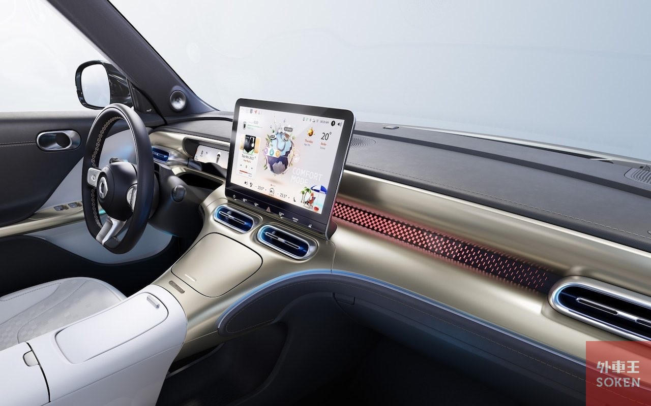 スマート#1のインテリアは非常に高級感があり、12.8インチのタッチスクリーンディスプレイに加えて、9.2インチのコップピットディスプレイがスマートな印象を与える。スマートだけに。