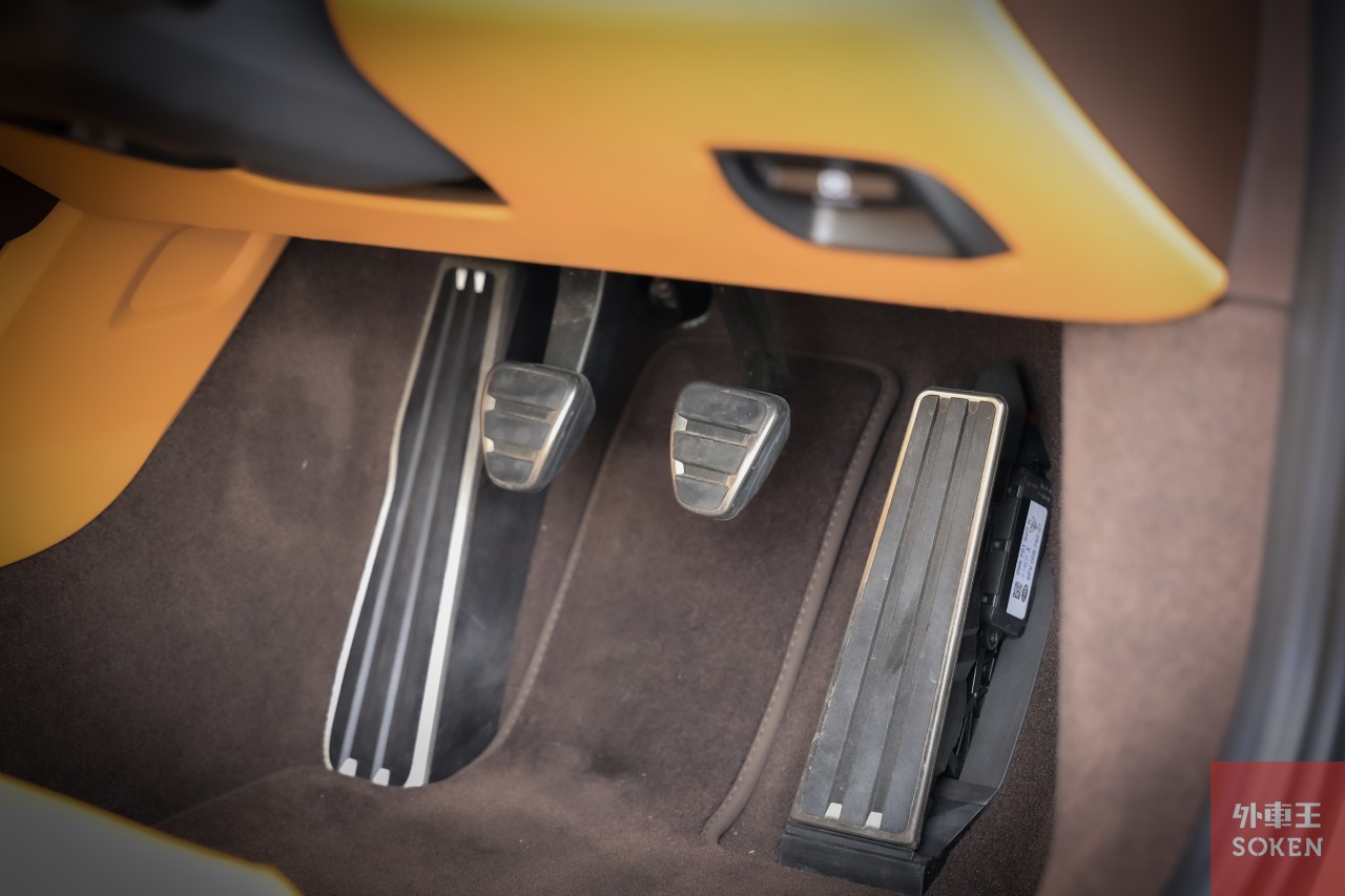▲OP扱いのエスプレッソ&コニャックレザーインテリア仕様。足元のペダル類が3つある(3ペダルMT)であることも注目
