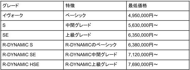 グレードは、ベーシックな「イヴォーク」のほか、中間グレードの「S」、上級グレードの「SE」があります。また、スポーティーな装備を身に纏った「R-DYNAMIC」もカタログモデルとして用意され、ベースの「R-DYNAMIC S」、中間グレードの「R-DYNAMIC SE」、上級グレードの「R-DYNAMIC HSE」の3種類を展開しています。