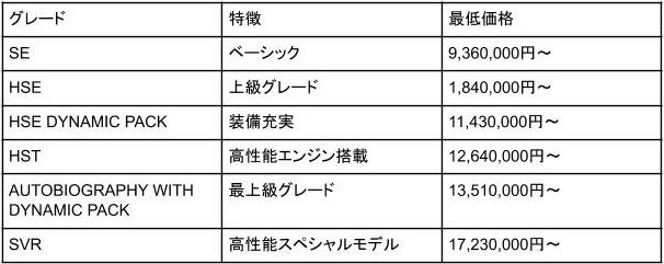 ベーシックな「SE」のほか、上級グレードの「HSE」、装備が充実した「HSE DYNAMIC PACK」、高い走行性能を発揮するエンジンを搭載した「HST」、最上級グレードの「AUTOBIOGRAPHY WITH DYNAMIC PACK」を展開しています。また、スペシャルモデルとして、優れた動力性能を備えたスポーツモデル「SVR」のラインナップもあります。