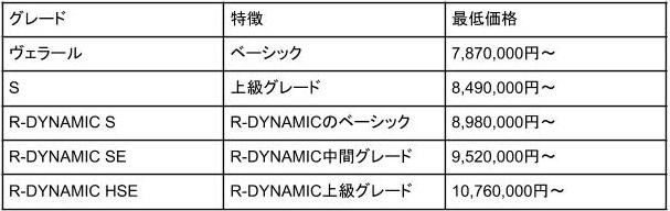 グレードは、ベーシックな「ヴェラール」、上級グレードの「S」です。また、スポーティーな装備を身につけた「R-DYNAMIC」を用意しており、ベースグレードの「R-DYNAMIC S」、中間グレードの「R-DYNAMIC SE」、上級グレードの「R-DYNAMIC HSE」の3種類を展開しています。