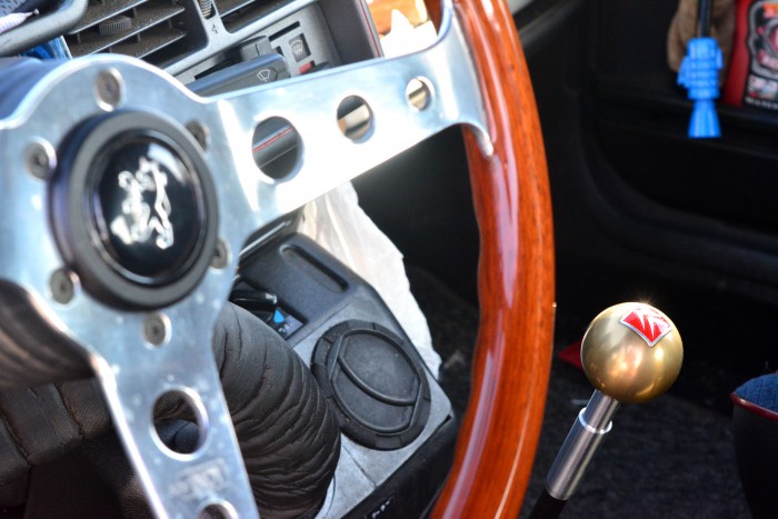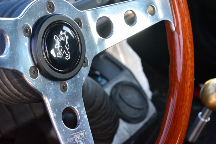 ▲AXのエンジンルームと車内も拝見させていただきました。真鍮製のシフトノブは「手が10円玉臭くなる!」とのこと(笑)。AXはプジョーの205・106とも親戚さんということで(?)、ステアリングはプジョーのライオンと思いきや…